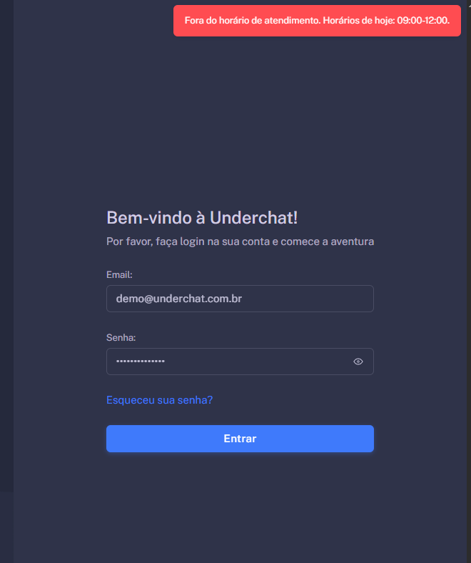 Se o usuário tentar fazer login fora do horário permitido, o sistema exibirá um aviso na tela de acesso informando que ele está fora do horário de atendimento.